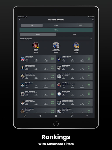3. Competitors Rankings - On the competitors rankings page, we created our filter ultra advance. You can sort by season, age, belt, weight, gi or nogi. Wish to know more about the competitor simply click on his profile. There are also privacy settings available for this part of the application.